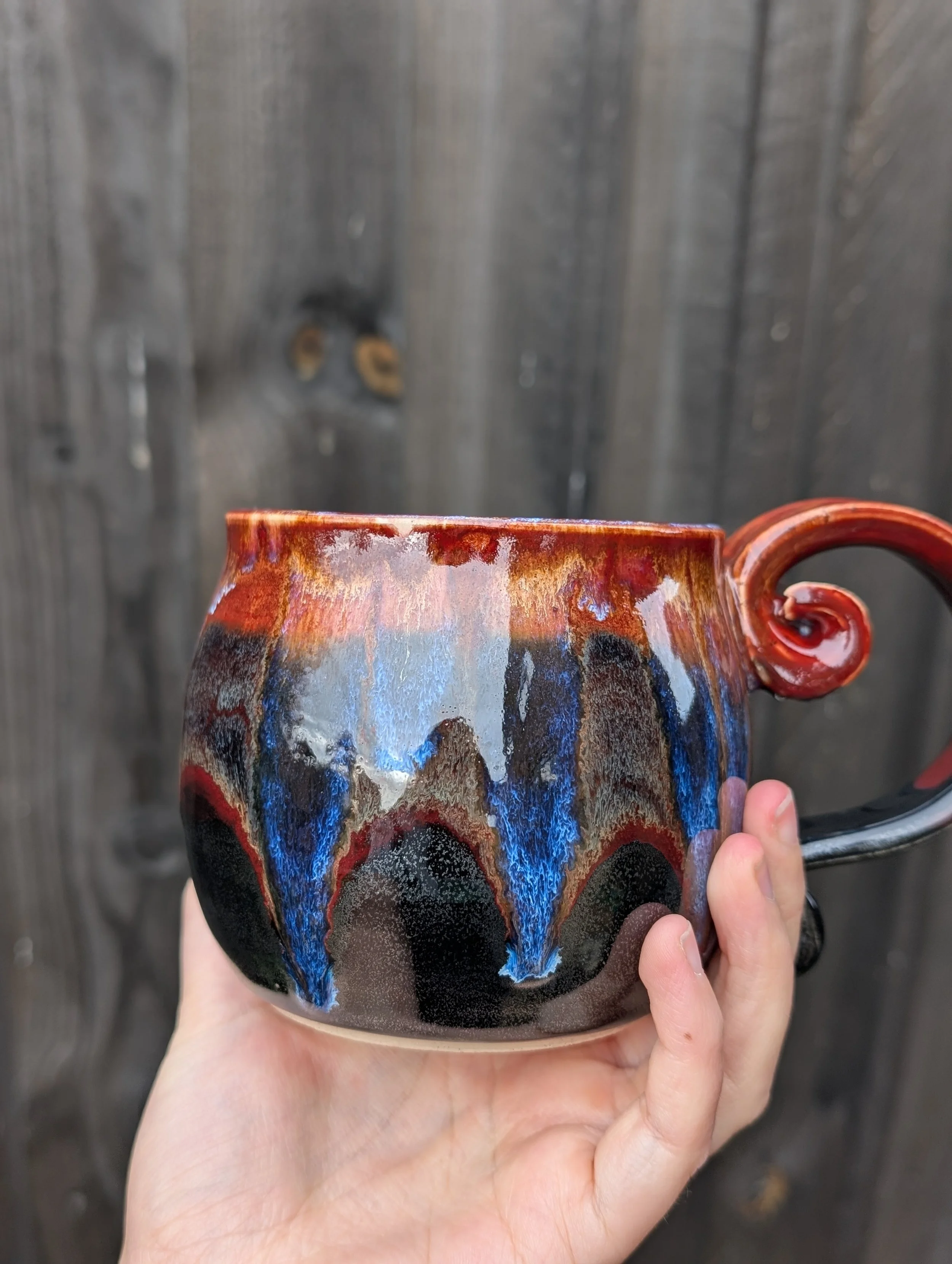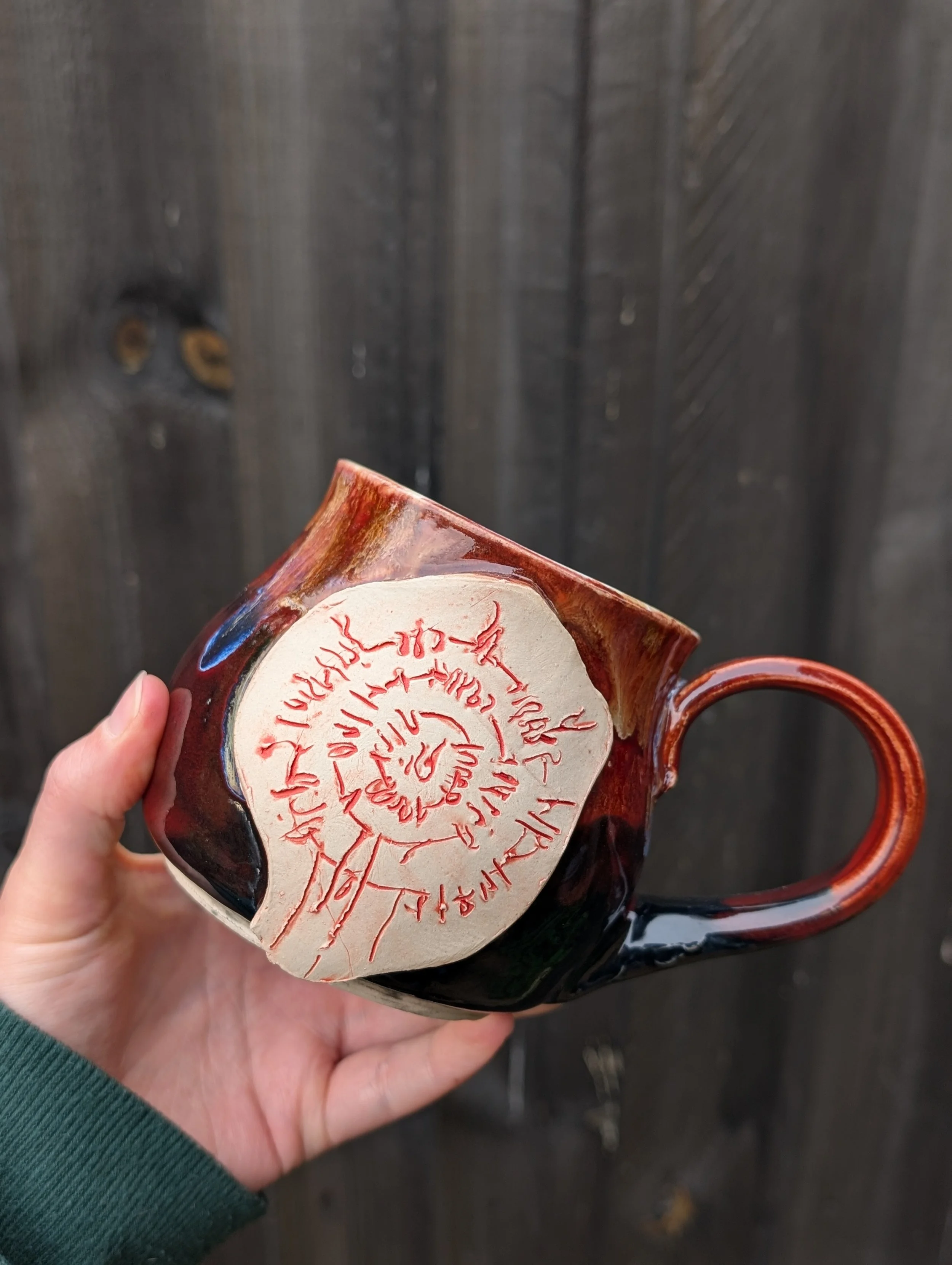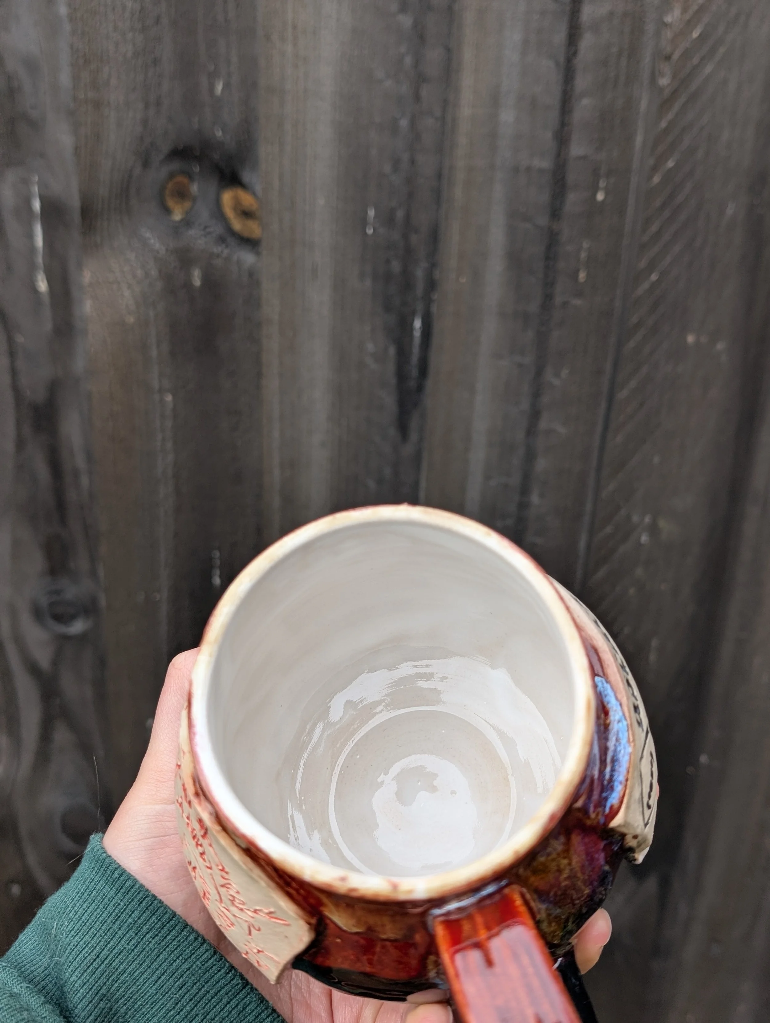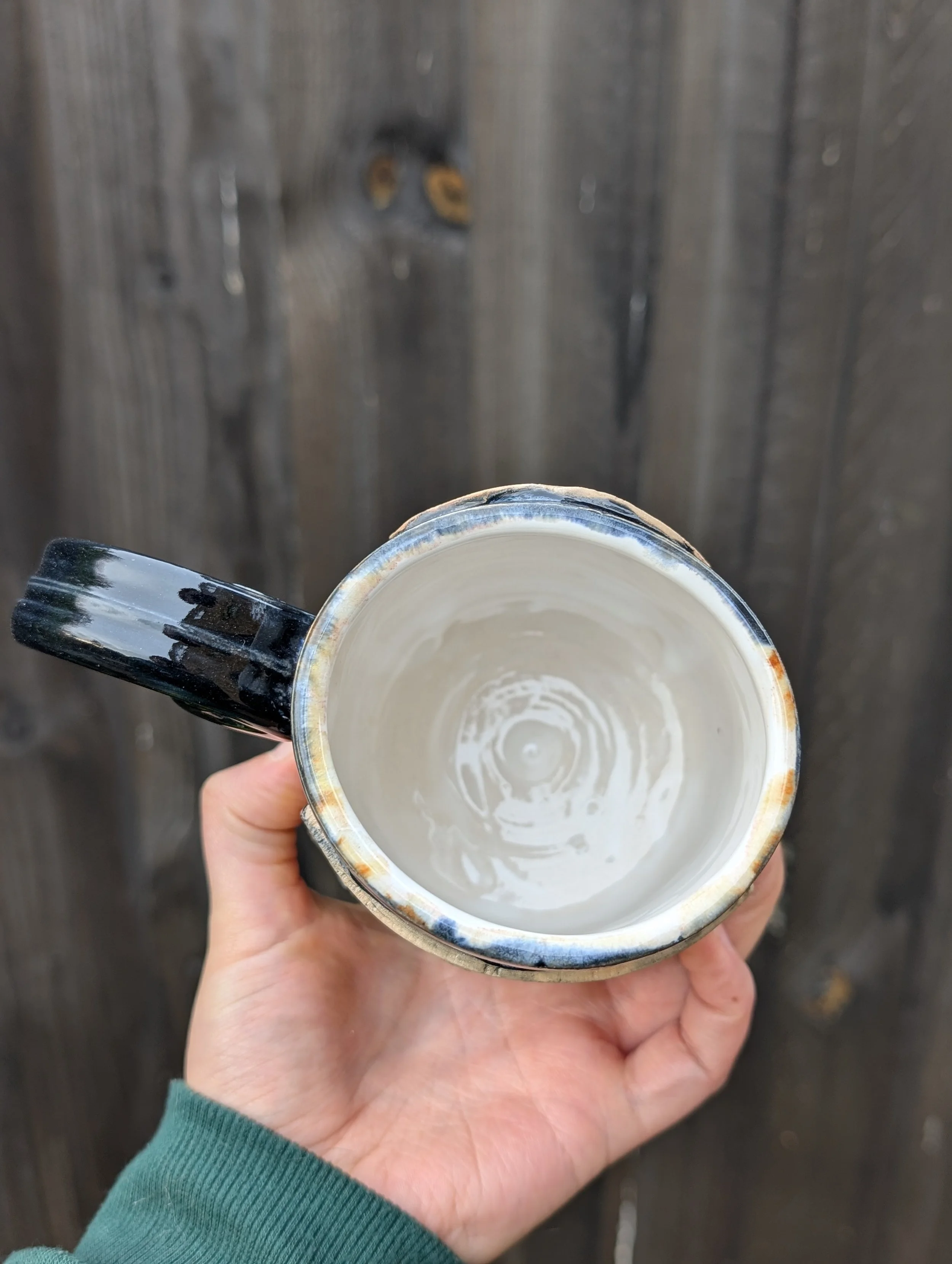 Hand thrown mug made with stoneware clay. Hand decorated and glazed.