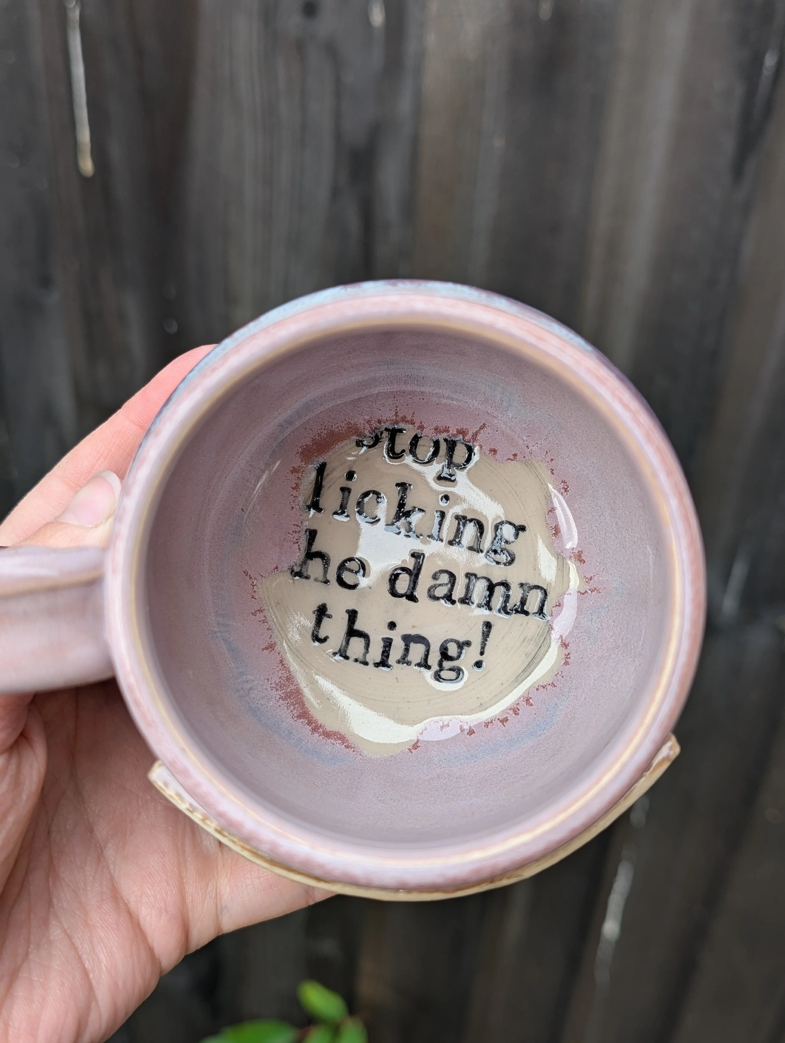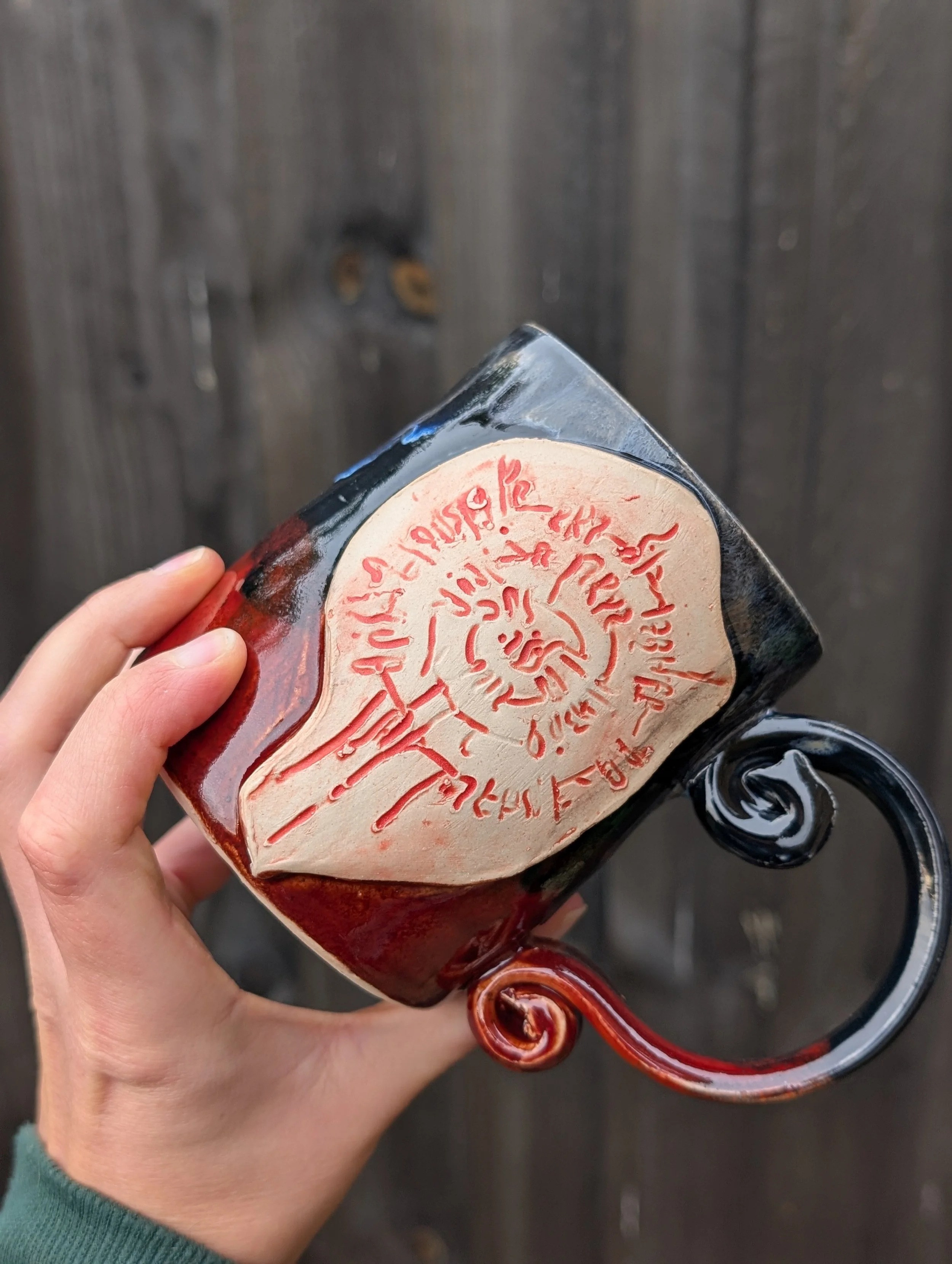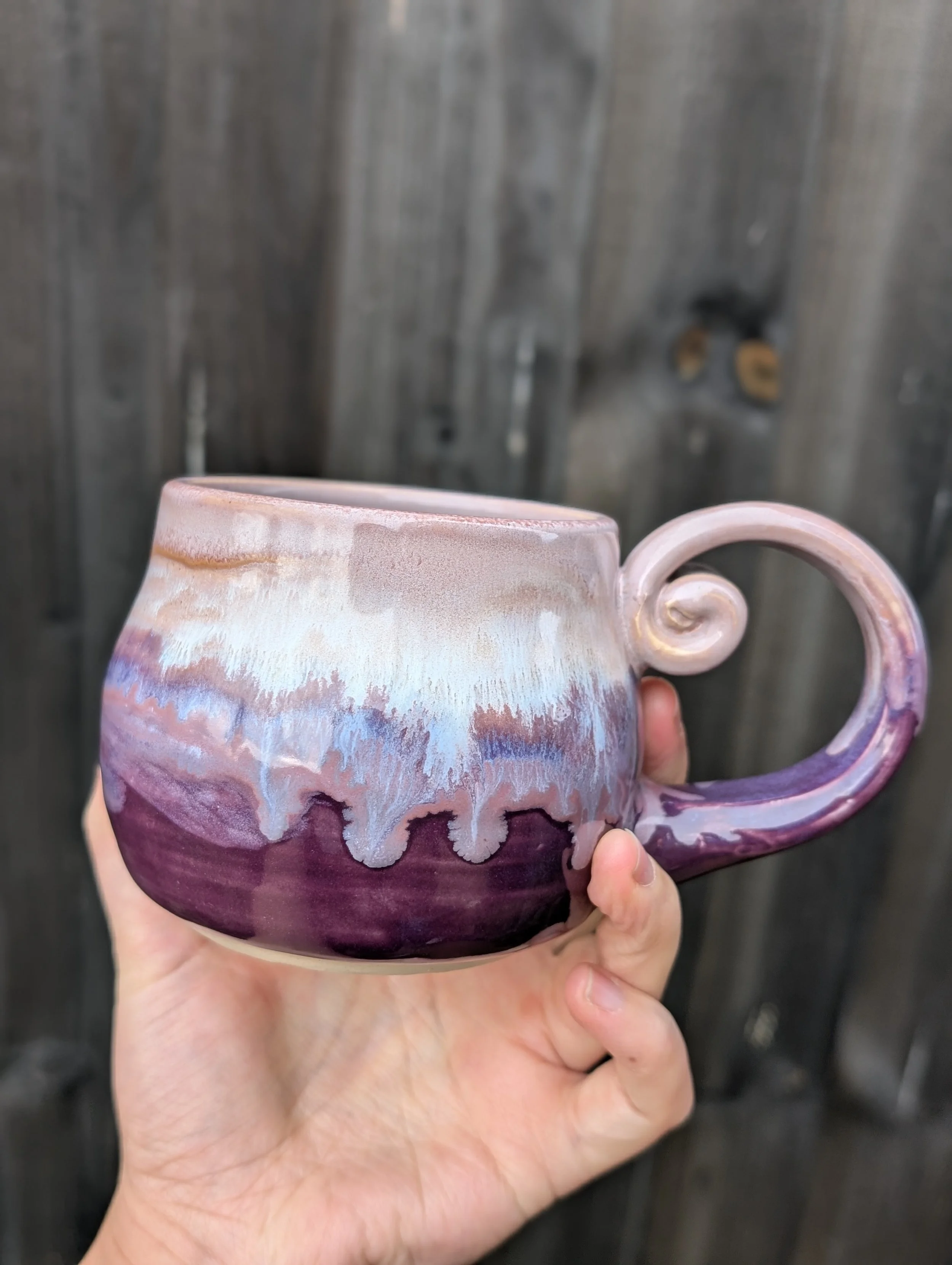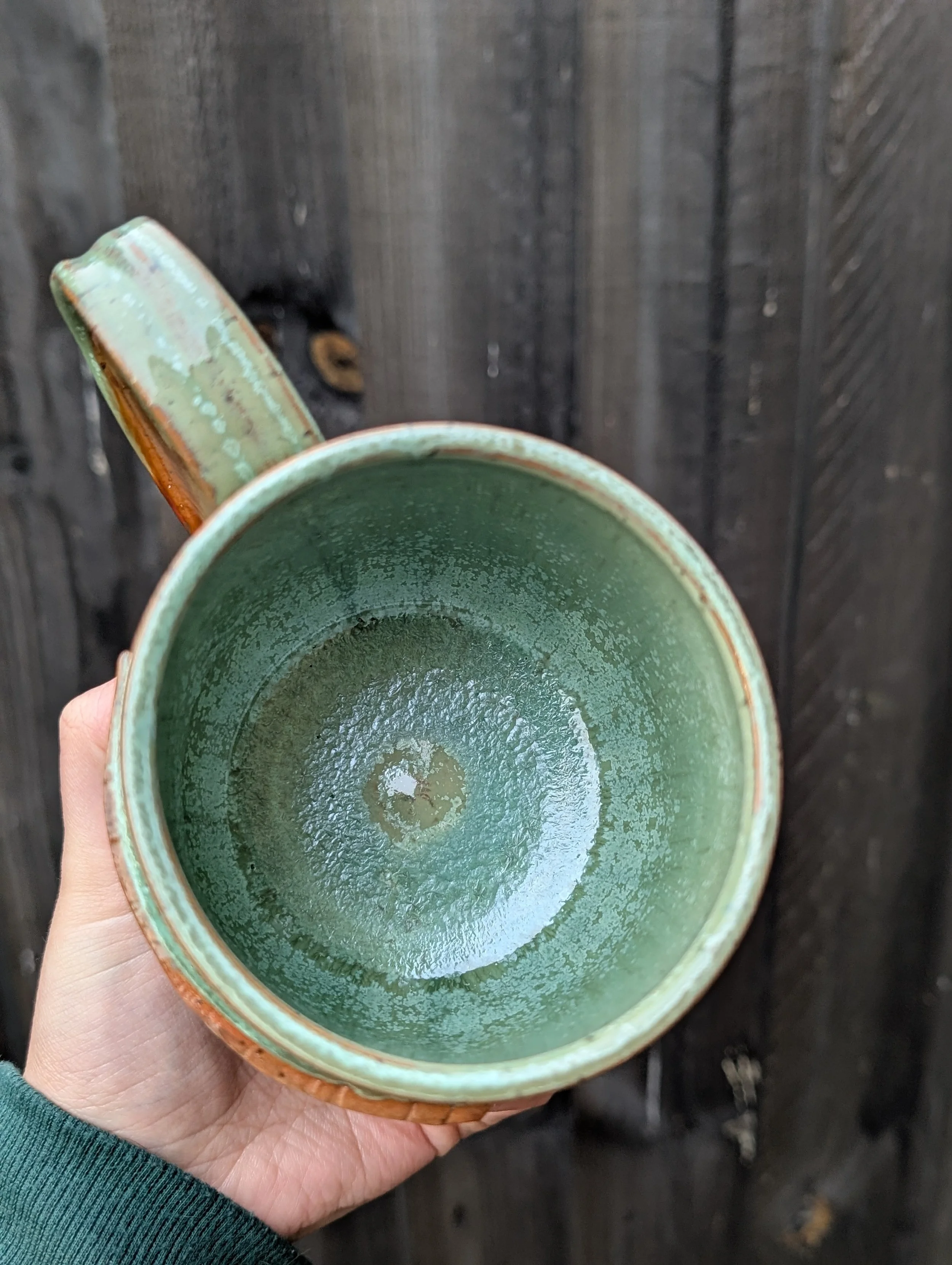 Hand thrown mug made with stoneware clay. Hand decorated and glazed.