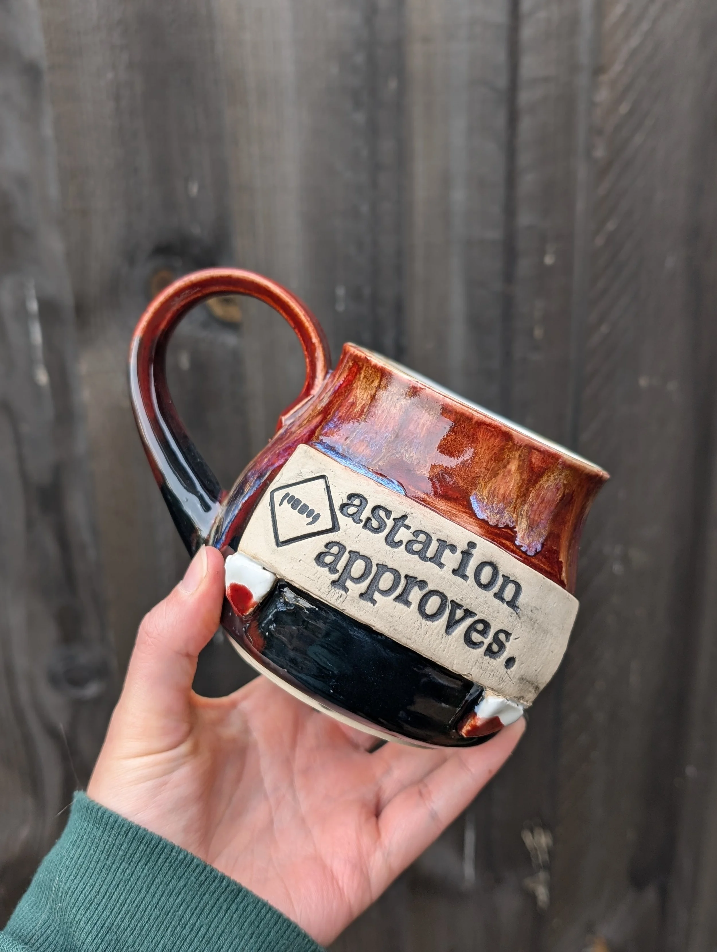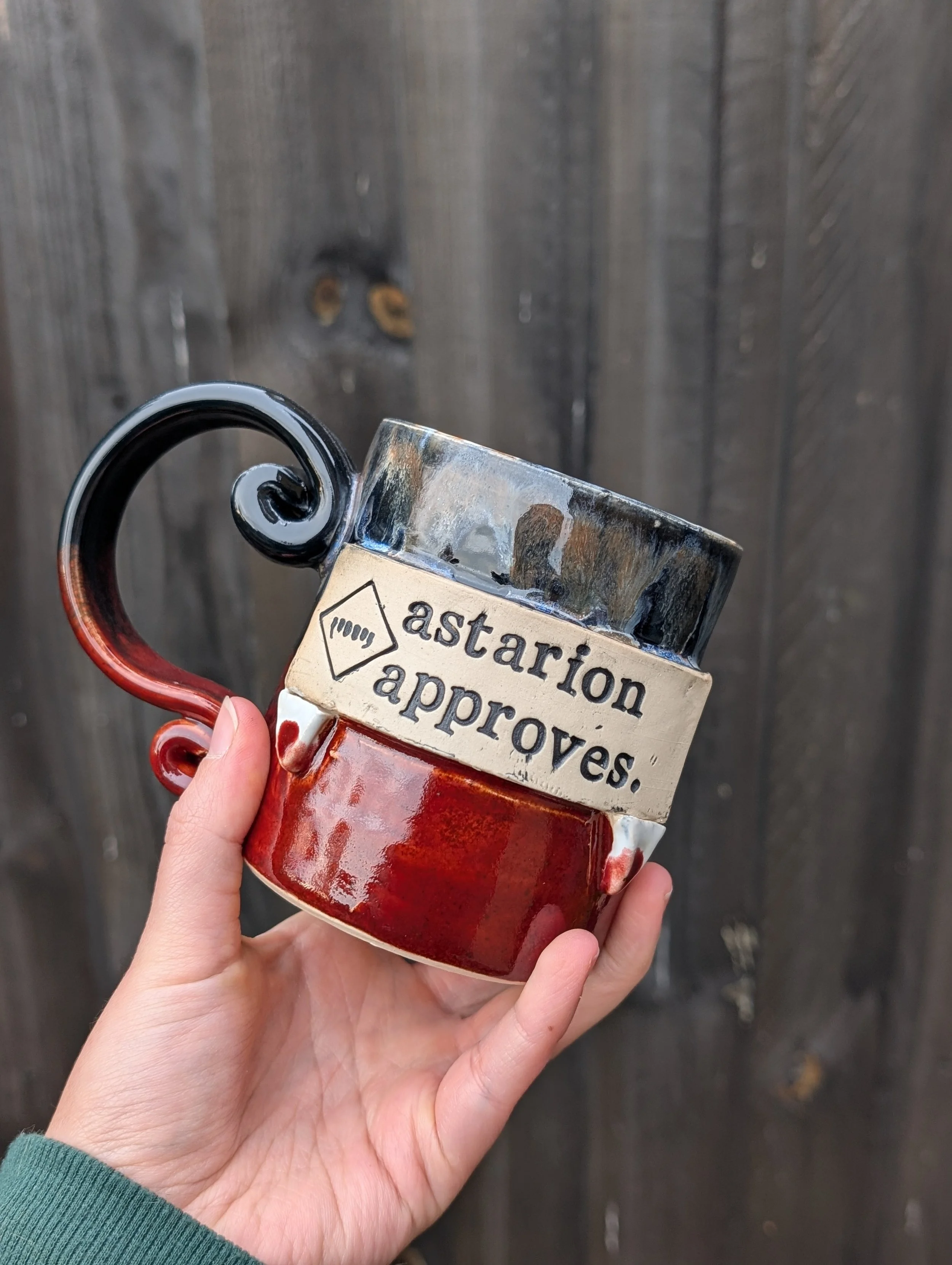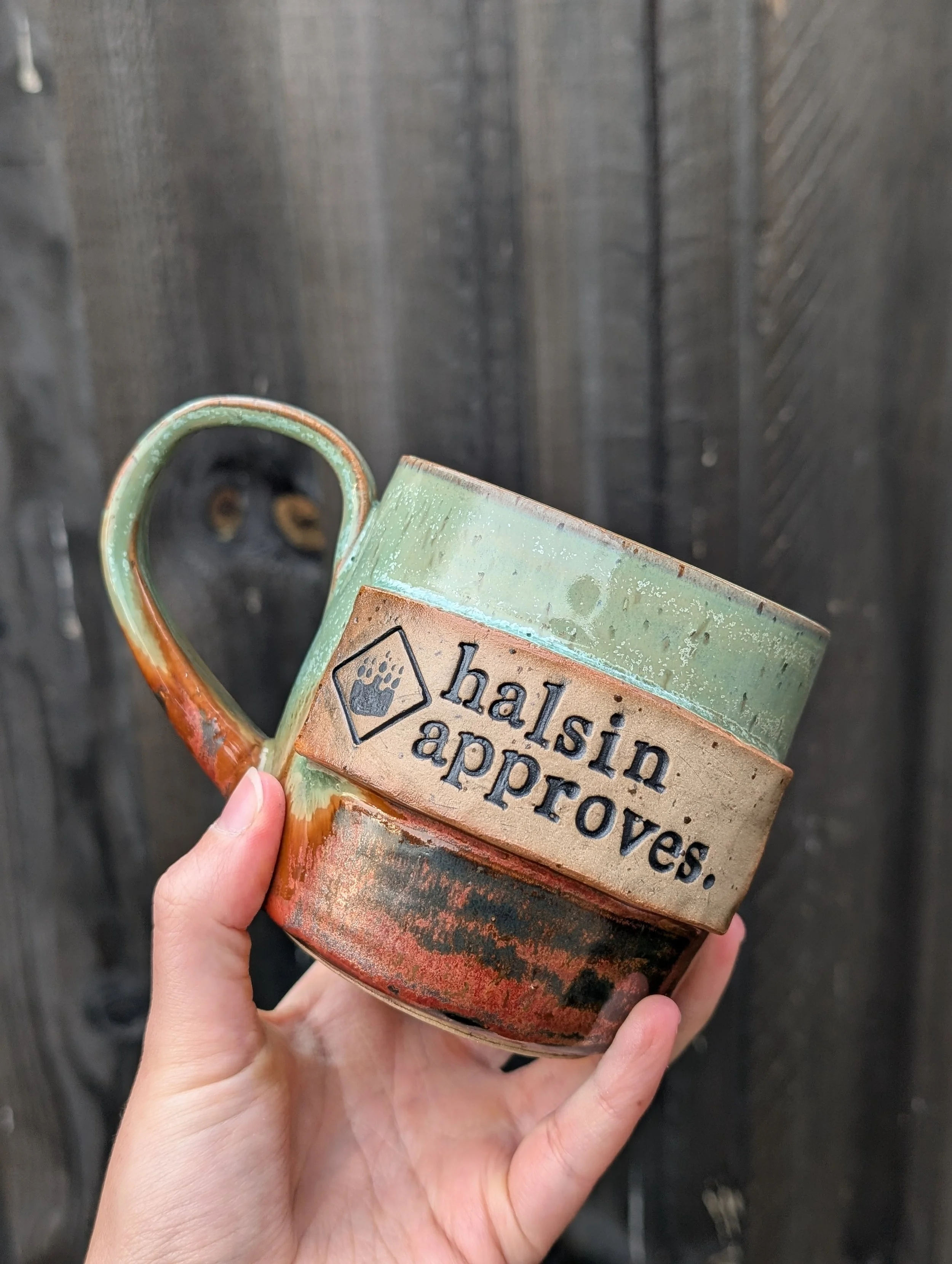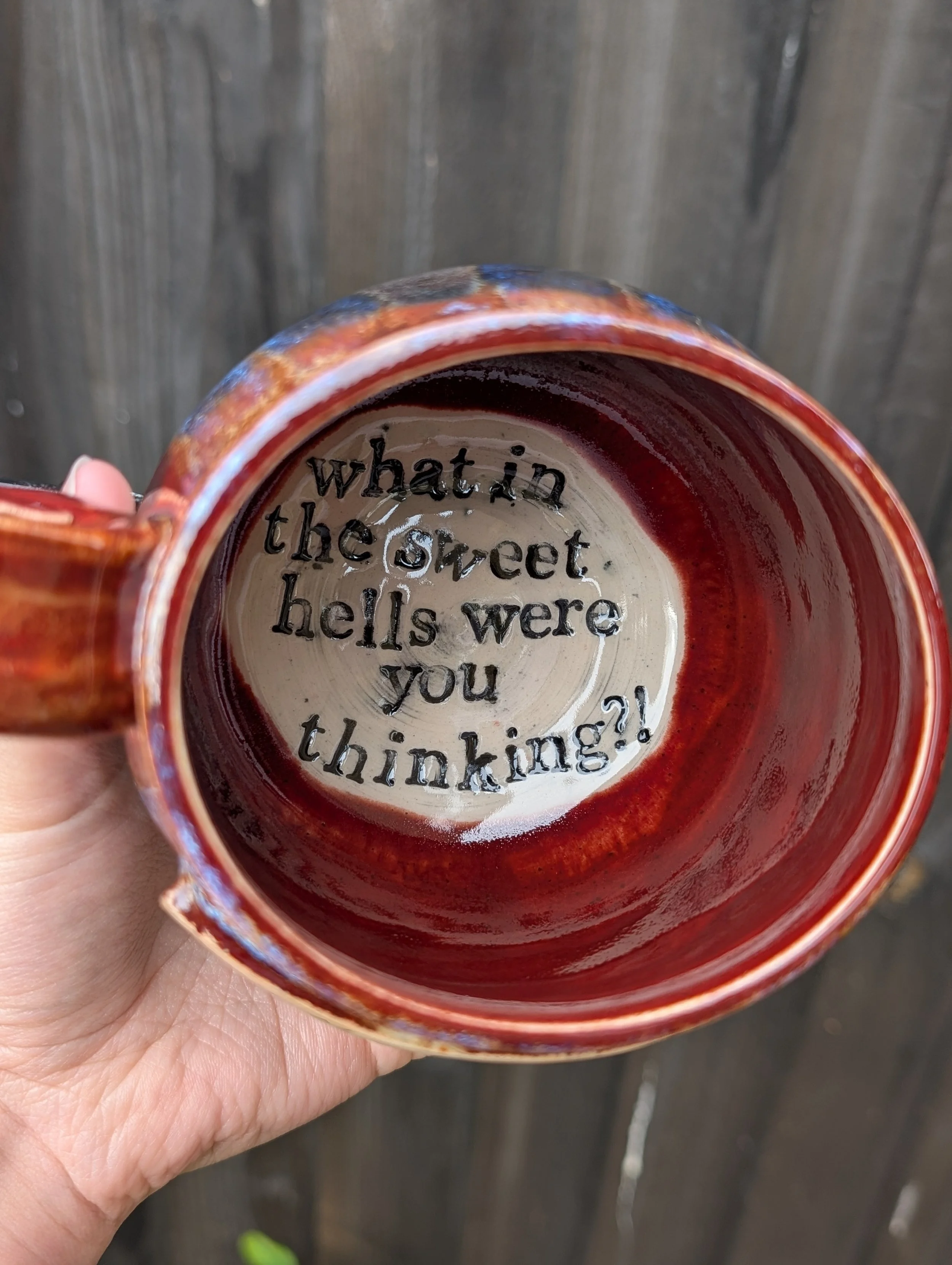 Hand thrown mug made with stoneware clay. Hand decorated and glazed.